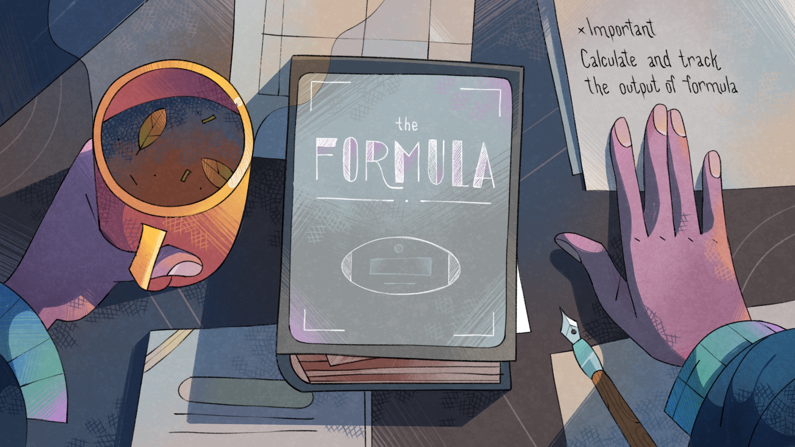 Inside the cover of the book is a sheet of paper on which someone has scribbled a few words telling you to "calculate and track the output of the formula".