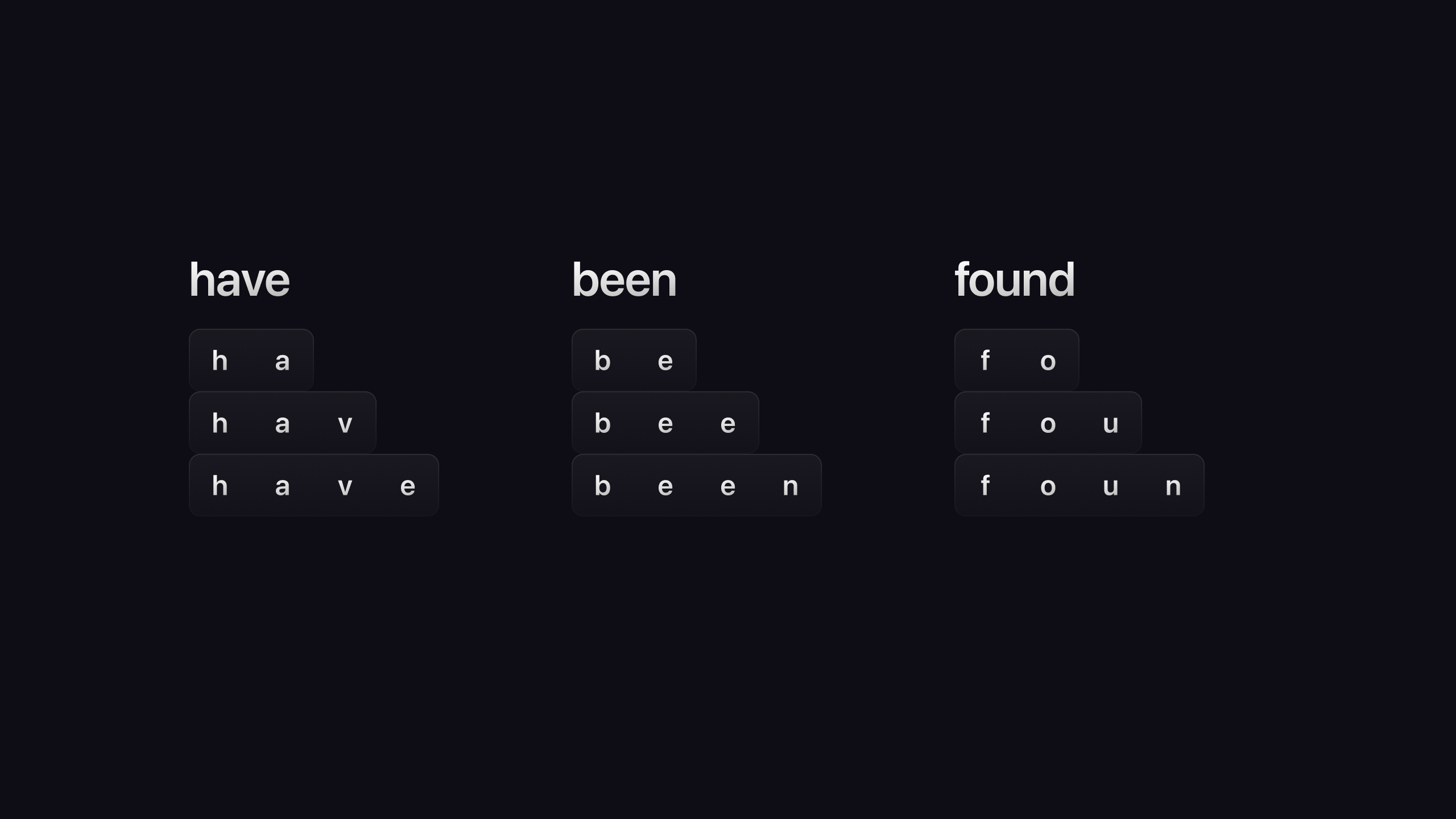 edgengram ("edge ngram"): This keyword is also followed by two numbers inside parentheses such as (2,4). An edgengram will create a token for every possible size starting at the beginning of the word of a length between the two numbers. So if you tokenise "have been found" by blank and then follow up with edgengram(2,4), the transformed output will be: have into ["ha", "hav", "have"], been into ["be", "bee", "been"], and found into ["fo", "fou", "foun"].