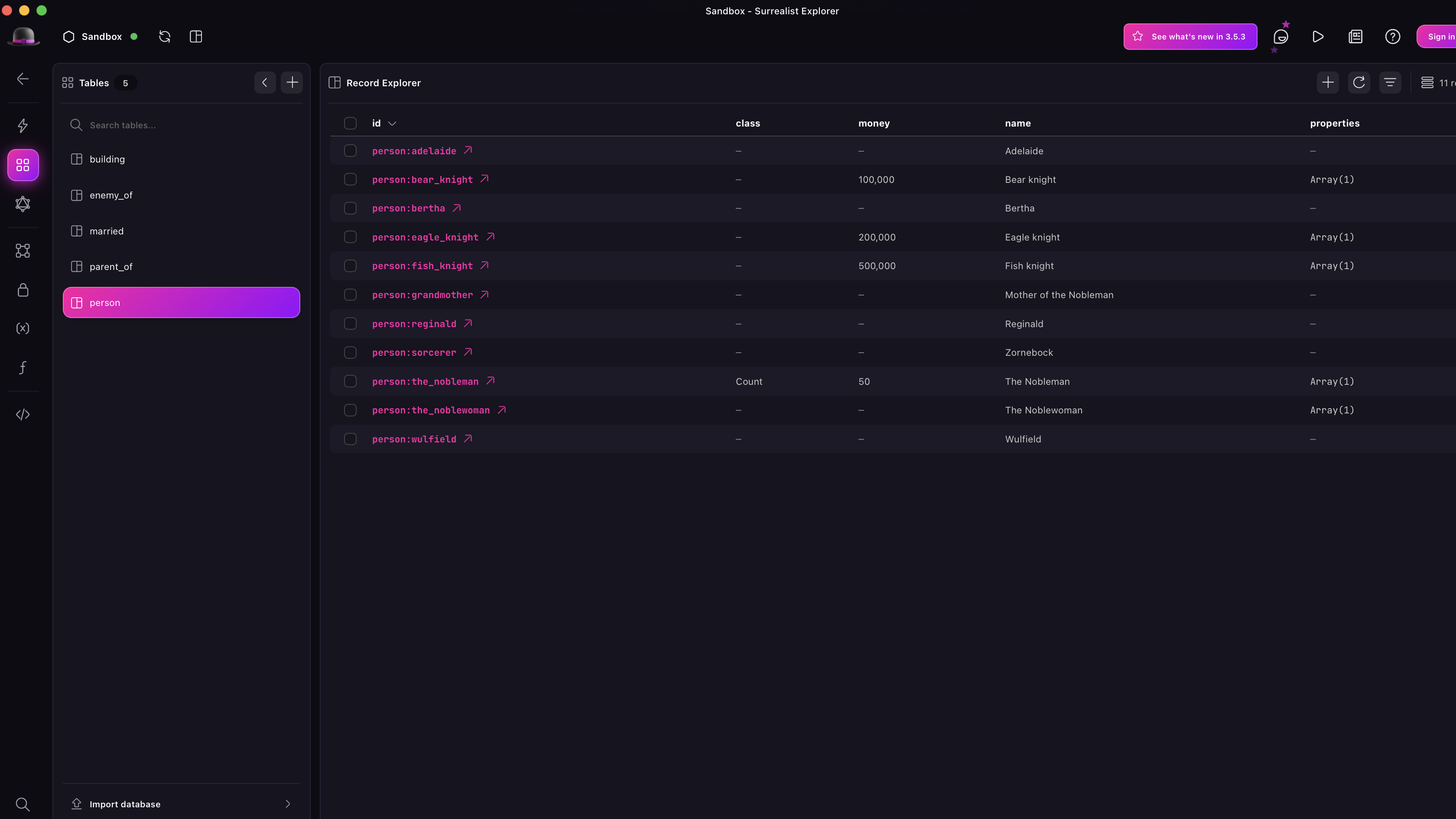 Back in chapter 8, we finished up a multi-chapter project involving most of the characters from the old German story The Enchanted Knights. The project was focused on learning to use the RELATE statement and getting used to graph queries using the -> operator, as well as the beginnings of learning how to define schema. Let's pull up the dataset from that chapter to see what it looks like inside Surrealist's Explorer view.