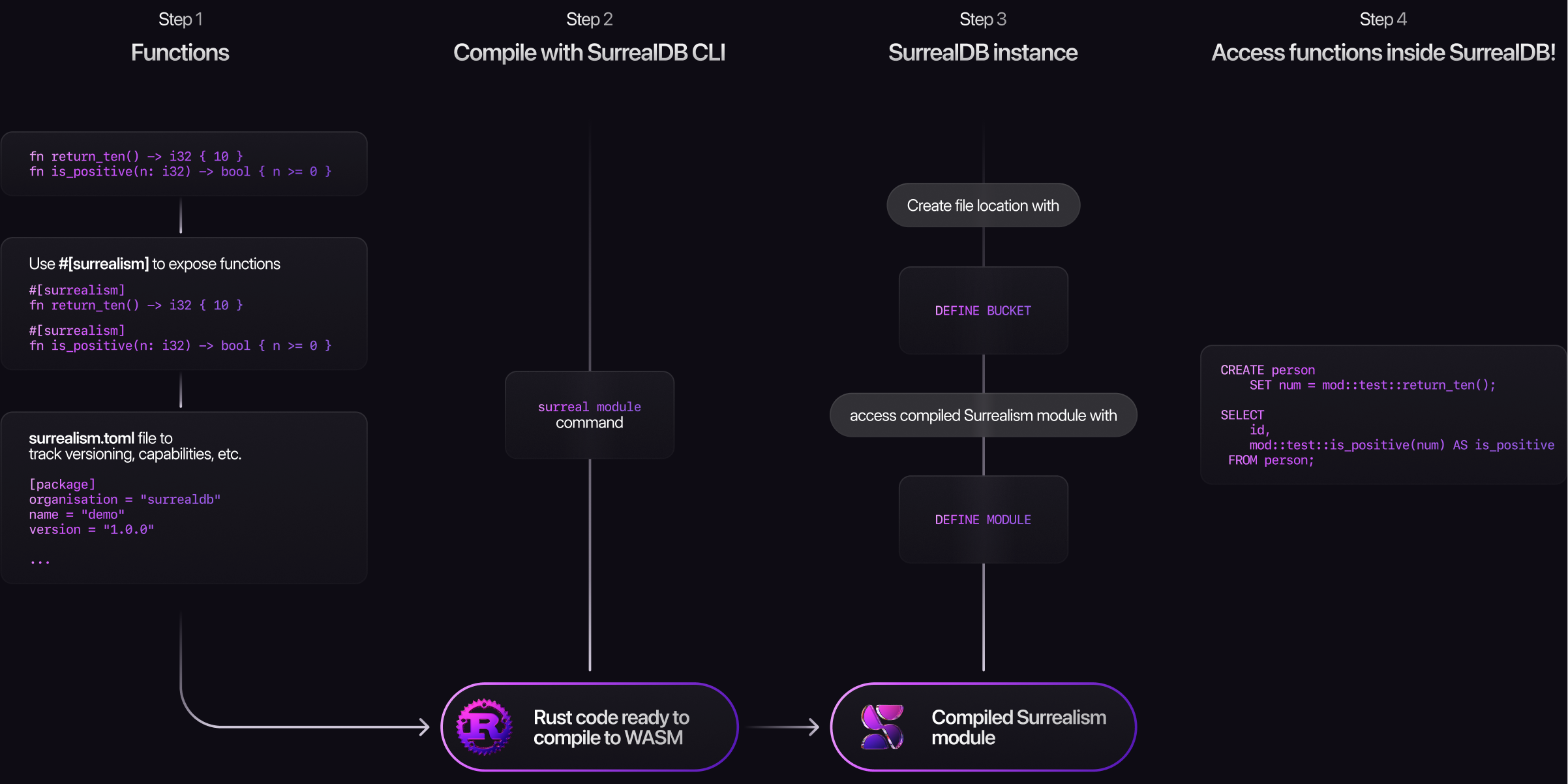 Write your functions, compile into WebAssembly, load them into SurrealDB, and call them from SurrealQL
